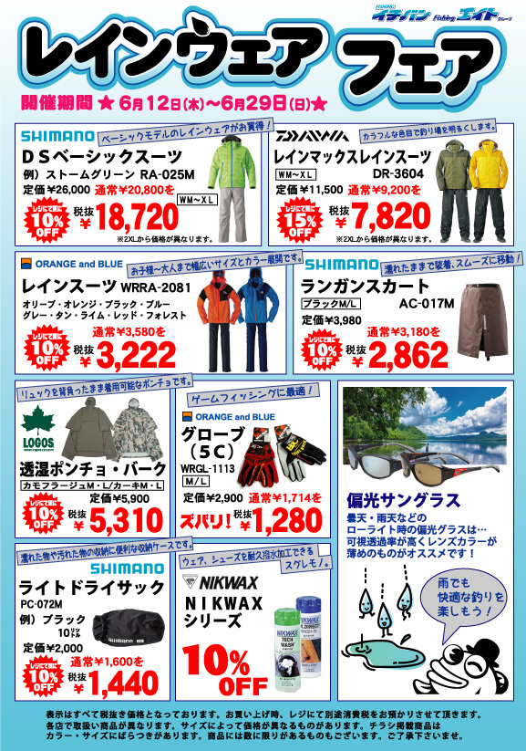 レインウェアフェア | つり具豊富フィッシングイチバン・エイト大阪・京都の大型釣具店