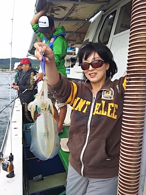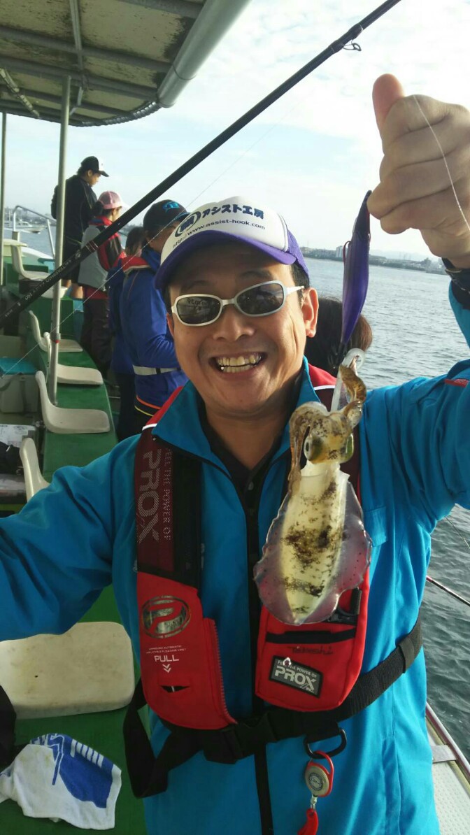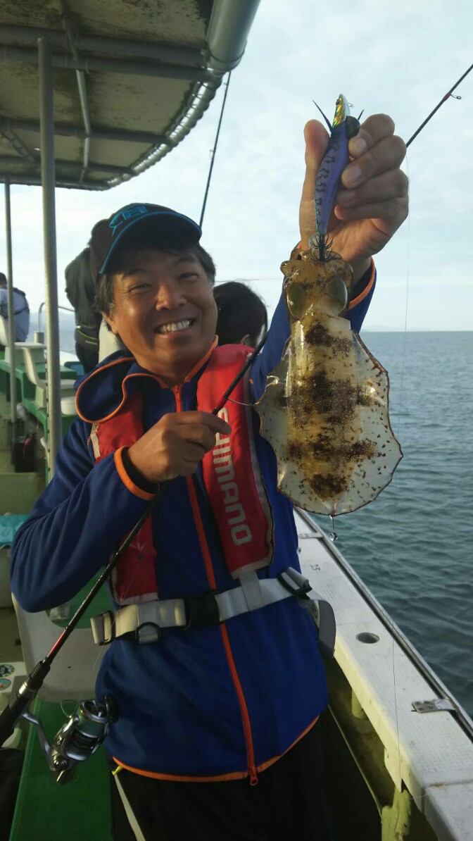 最近は天気が ずーーーっと悪く雨の中での釣りを覚悟していたのですが、普段の行いが良かったのか?? この日は曇りで快適でした。 今が旬、しかも人気の釣りなので平日にもかかわらず船は満席!! 30号のオモリの胴突き仕掛で1ヒロのエダスにエギを付けて釣るのですが、ポイントによっては潮の流れが速くオマツリする事も何度かありました。それでも店長に世話してもらってくじける事なく釣りを続けました、店長ありがとう。( 感謝 )