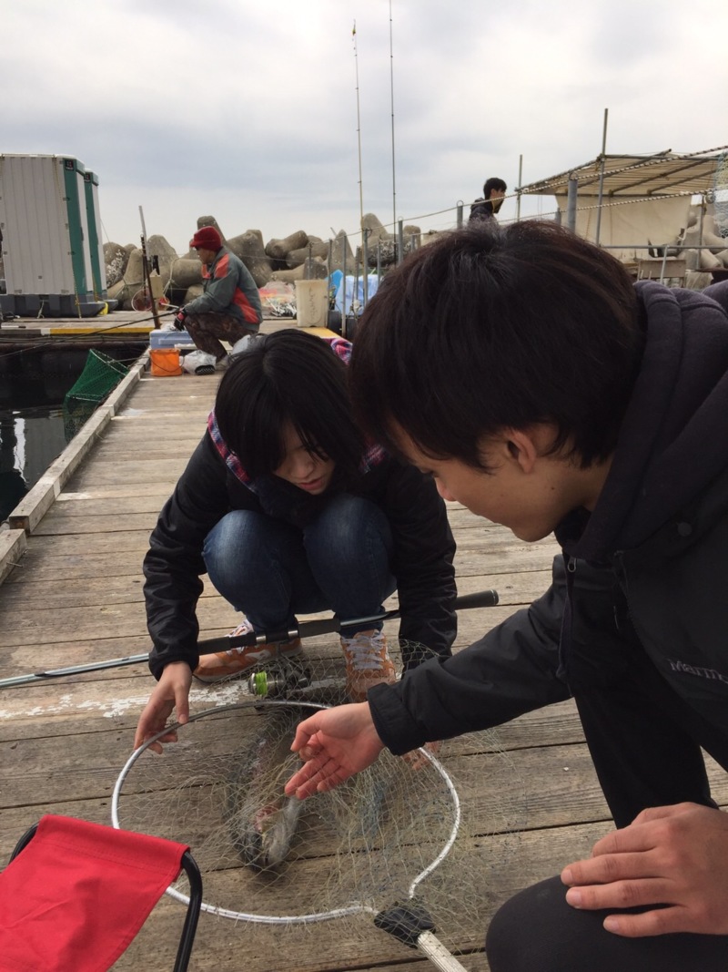 そうしているうちに、黒ソイの放流時間が来ました。釣堀の人に底を狙って、キビナゴを着けると良いよ!とアドバイスを頂き、実践。するとウキがゆっくりと沈んでいき、なんとか黒ソイを2匹釣れました。その後雨が降り始めたので橋下に移動し、真鯛等を狙っていきました。底ギリギリのたなで、ささみを着けてほったらかしにしていると、いきなりウキが勢いよく沈んで行きました!急いで合わせるとサーモンがかかっていました。皆で同じようにしましたが、そこからアタリがぱたりと来なくなりそのまま終了しました…。