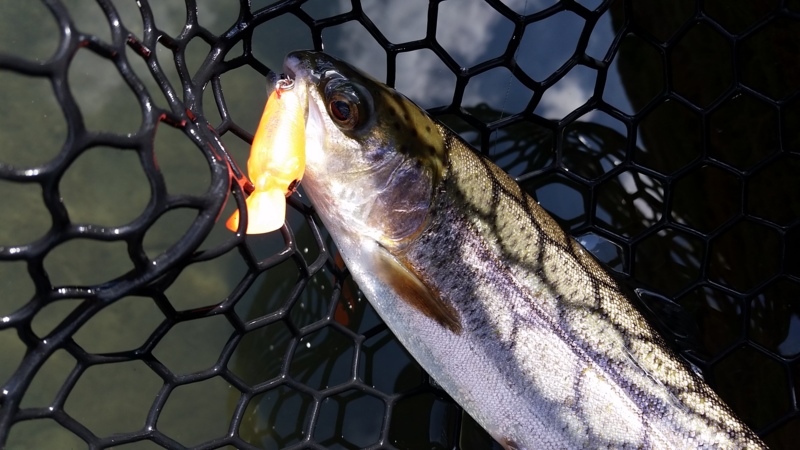 朝イチはとりあえず1gクラスのスプーンで高活性タイムで二人ともサクサクッと連発!その後もカラーとウエイト、アクションを変えながら数を伸ばします。ですが流石にスレてきたのでボトム系の釣りに変更するも、横の動きのほうが反応良いらしくボトムではポロポロ程度。ボトムを見切りクランクにシフトするとここから連発!カラーはクランク・スプーン共にクリーム系が反応良かったです。その後、昼の放流に期待しましたが食いが一気に止まり終了。