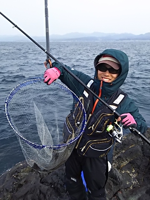 準備をしていると、磯釣り4回目という店のスタッフ・新谷さんも来ていたので、同じ磯に上がることにしました。 いよいよ実釣、しばらくすると新谷さんの竿が大きく曲がり、慎重にやり取りして取り込んだのは私みたいにお腹が膨れた35cmのグレ。 「こんな形のグレ いるんですかぁ!」と 満面の笑みの新谷さんに、私も嬉しくなり写真を撮ってあげました。