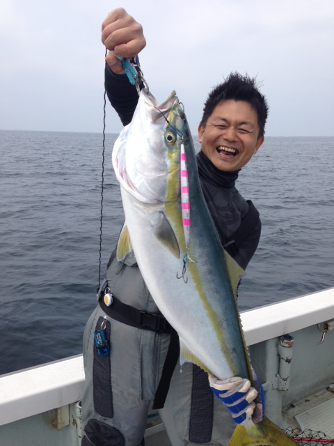 3月末、春の丹後沖にブリを狙いに行きました。本命の白石グリは決して甘い状況でなく、まずは中浜沖70mの瀬からスタート。事前情報ではベイトはコイカが多く、水平にスライドフォールするランス160~200gのロングフォールが効果的との事。まずは活性を上げる為にスピニングの早巻きでスタート、瀬の付近で潮噛み感を感じた3投目、グローカラーのガタージグ200gにドスンとヒット、2号タックルでそこそこ走られながら7㎏サイズのブリをキャッチ。程なく迫田も同サイズをキャッチ、こちらはランスのロングフォール。このまま楽勝かと思いきや、イルカが現れひたすら我慢のジギング・・・。夕方に白石に入り酒井船長も竿を出すと、ロングフォールで一人勝ち!ブリ・メジロ・マダイを次々とヒット! ベイトは勿論、スピニングでもロングフォールで連発、ラインの変化でアタリを取る感覚、ジグはランスの160~200g。ドテラ流しですが、ベイトタックルで3~5シャクリ後にロングフォールの3セット×2・3回でピックアップして打ち直し。フォール中のジグを追尾している事が多く着底後レスポンスの速さとラインの変化を感じた後のフッキングまでの早さの勝るベイトタックル。従来のスピニングとは異なるジギング、春にお試しを。