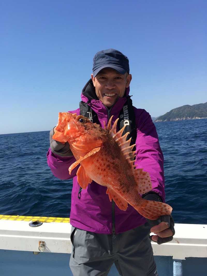 感心していると今度は同行者の床並もヒットし、はやくも良型確保!こちらとしてはあせりますが、船長のアドバイスどおり底取りを何度も繰り返していくと根掛かりしたかのような重みが!聞き合わせからしっかりと合わせを入れ直すと会心の重量感と手ごたえ!一気に巻きあげますがオニカサゴは水圧の変化に強いため暴れながらしかも大口を開けたまま水面までくるので何とも言えません!