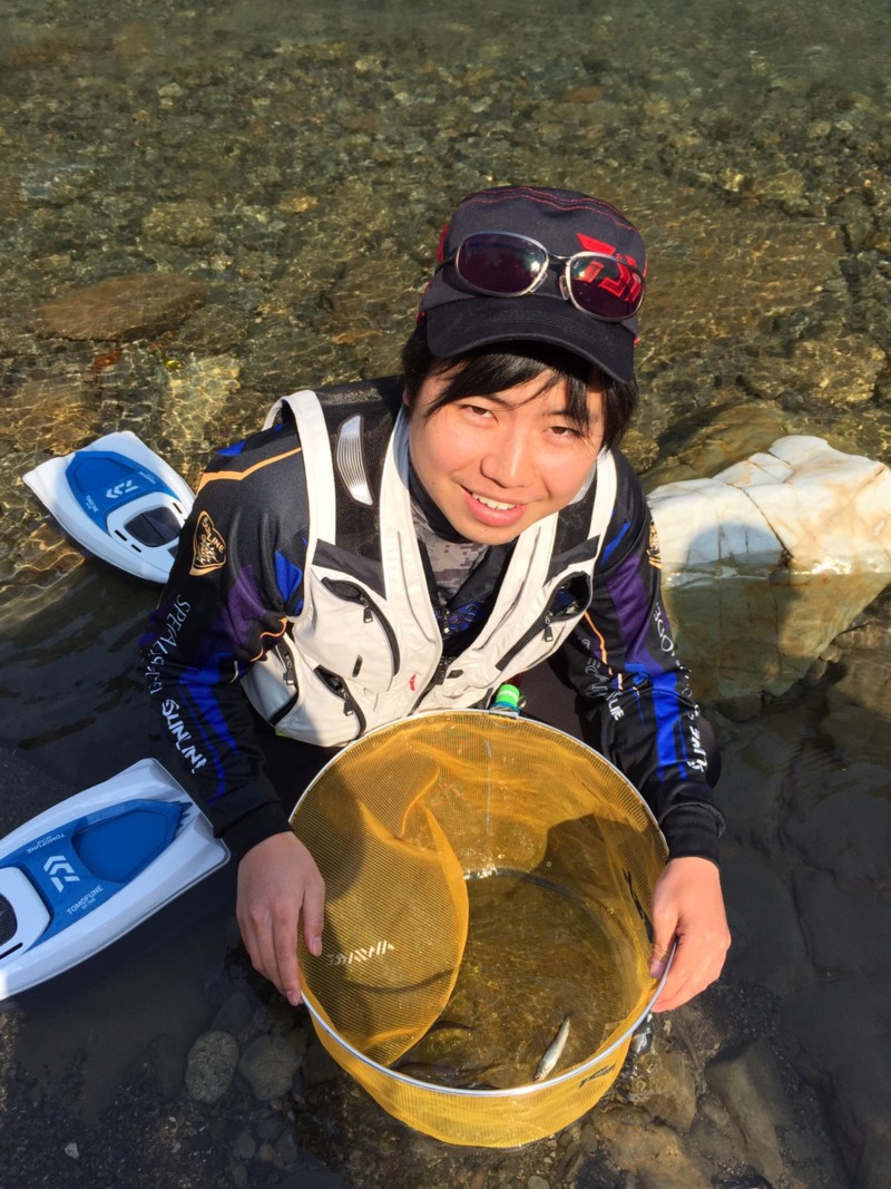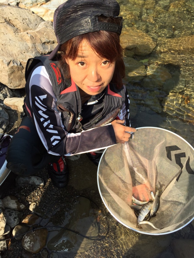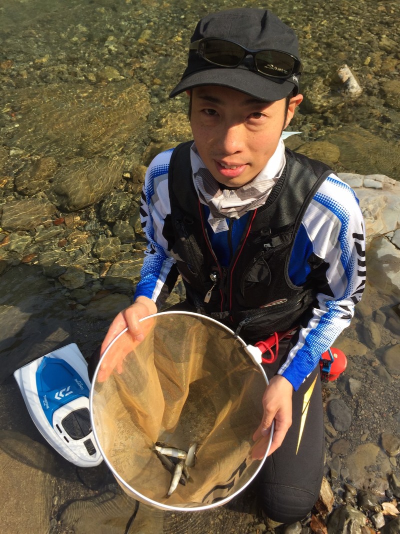 まだまだ冷たい川に震えながらオトリを泳がすと開始15分ほどで10cmほどですが、海産の鮎をゲット。鮎の存在を確認できたので一安心。