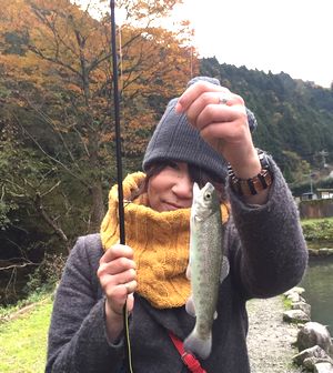 雨上がりで水が濁っておりウキも小さいので、最初はなかなか合わせるのが上手くできず、またラインを引くのも遅くてバラしまくっていましたが、だんだん慣れてきてフライでも数匹のニジマスをゲットしました。