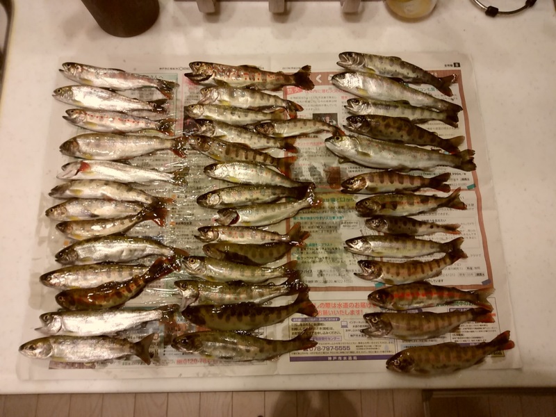 寒波が来る前に冬の釣りにでも・・・と、ワカサギとアマゴを釣りに丹波方面に。午前中は、新桟橋も出来たと聞く佐仲ダムでワカサギ釣りをスタート。なかなかの賑わいで釣客も多数いらっしゃいました。が、釣果の方はきびしく、午前の部は10匹以下に終わりました。。。気をとりなおして午後の部、小柿渓谷に向かう。こちらも、なかなかの賑わいをみせていて、レストハウスから見てもアマゴを釣り上げている人も見受けられました。これは、期待できそうだ。オーソドックスな玉ウキと鈎だけというシンプルな仕掛けに、エサはイクラとブドウ虫を使用。川の流れにそわせながら、玉ウキがピクっと沈む・・・・すかさず竿をあおってあわせると、きれいなアマゴが釣れた!去年釣行に来たときよりもサイズは少し小さくなったが、3人で40匹超え!大満足の冬の釣りになりました。佐仲ダムも小柿