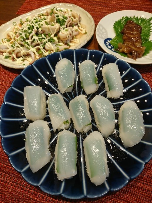 お寿司、沖漬け、ネギポン酢炒め、イカ丼にしました。