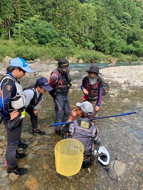 やや増水気味でササ濁りの中ですが名人の講習スタート。