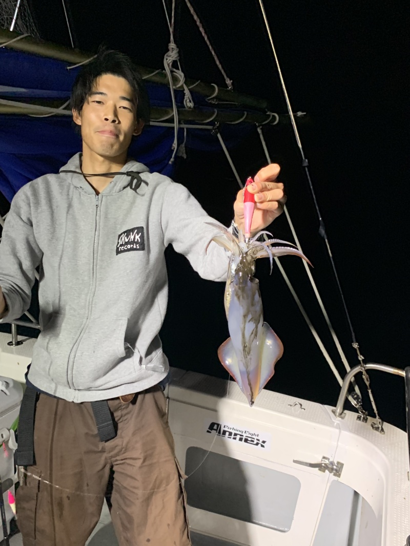 釣れたのは20cm程のアジでした。すぐ後にスタッフ鈴木もヒット。あがったのはガシラでした。その後もアジが1匹あがっただけで、ジギングは終了です。本命のイカ釣りが始まりました。水深は45m、潮の流れが速いので最低でも20号は必要でした。スッテは赤黄、ドロッパーはオレンジで始めてみました。こまめにシェイクしてからピタッと20秒キープで底を探っていましたが、なかなかかからず…。船長によるとあまり竿を動かさないほうが良いとの事でしたが、誰も釣れないまま次のポイントへ。次も水深は同じほどで、カラーチェンジしました。スッテをピンク紫に、ドロッパーを赤色系に、アクションも少しシェイクしたらほぼ動かさずに1分程キープしました。すると鈴木の竿にアタリが!やっとマイカGETです!しばらくするとスタッフ藤田の竿にもアタリがでました。次第にイカがあちこちで釣れはじめました。しかし、ラッシュもあっという間ですぐパタリとアタリが無くなってしまいました…。それでも粘っていると底で長谷川、鈴木が連続ヒット。なぜか左舷側だけがイカが連続ヒットが続くという状態に。