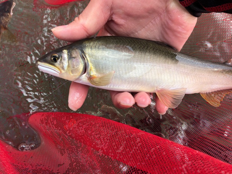 オトリが馴染んでしばらく扇状に探っているとゴンっと大きな手ごたえがあり今シーズン最大の引きに圧倒されながらキャッチしたのは24cmほどの鮎。