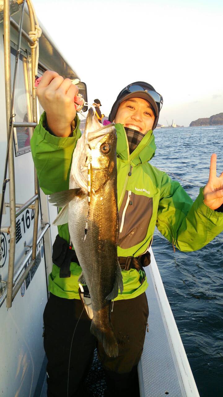 すると1投目から岡本にHIT!!上がってきたのは70cmぐらいのキレイなトーバスでした。フォールで当たったのでジャークのパターンとか分かりませんでしたが、いきなり時合い突入です。船中でダブルヒット・トリプルヒットは当たり前でした。