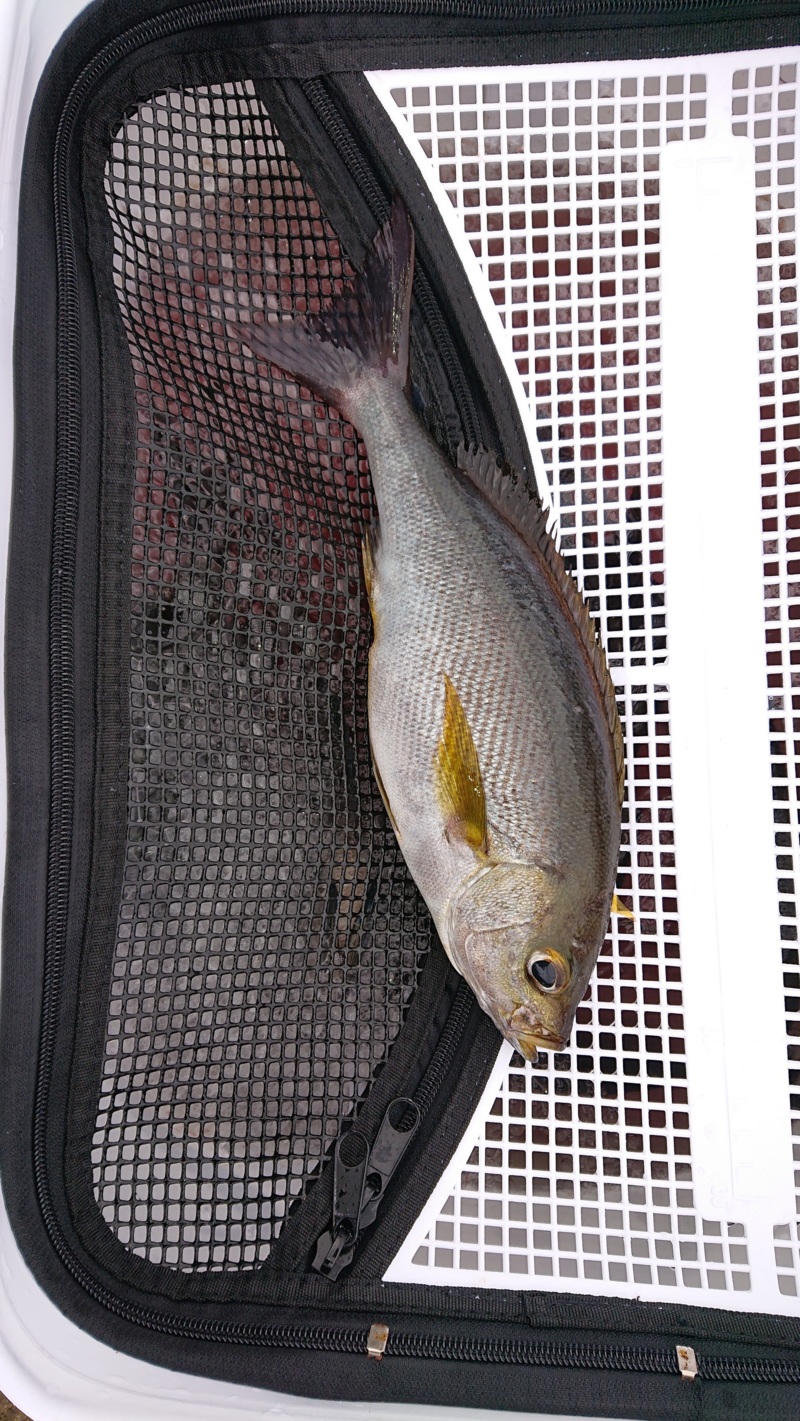 潮がイマイチ流れていないのか当たりがなくエサも取られない時間がありましたが、何気に回収したら居食いで初ヒット33cm程のグレをキャッチ。