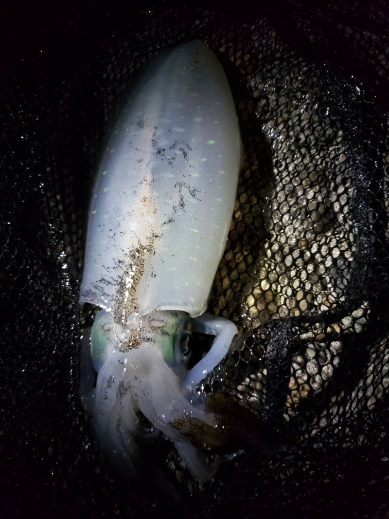 徐々に北上しながらポイント移動。すっかり空も暗くなり最後のポイントに到着してお気に入りのダートマックス3号で探るといきなりナイスサイズのアオリイカゲット!!