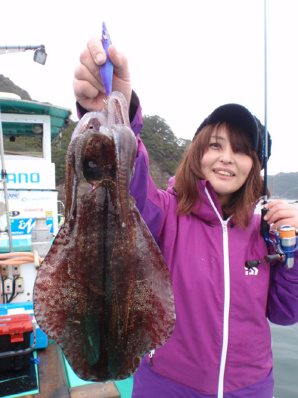 1番初めに釣ったのはエギ親父こと川上さん!さすがです!少し小さめのアオリイカをget!一方栗田さんと私は全くアタリもなく時間だけが過ぎていきました。焦ってもしょうがないので私は船長にレクチャーをお願いして練習することに!とてもわかりやすく教えていただけて勉強になりました!私は今までただ闇雲に投げてシャクるを繰り返すばかりでした。イメージが必要なんですね!そのあと1度アタリがありましたが15:30でフィニッシュ!結局川上さん2杯という結果になりました。初めてティップランが出来ると喜んでいた栗田さん・・・・・残念。次回に楽しみはとっておきましょー!
