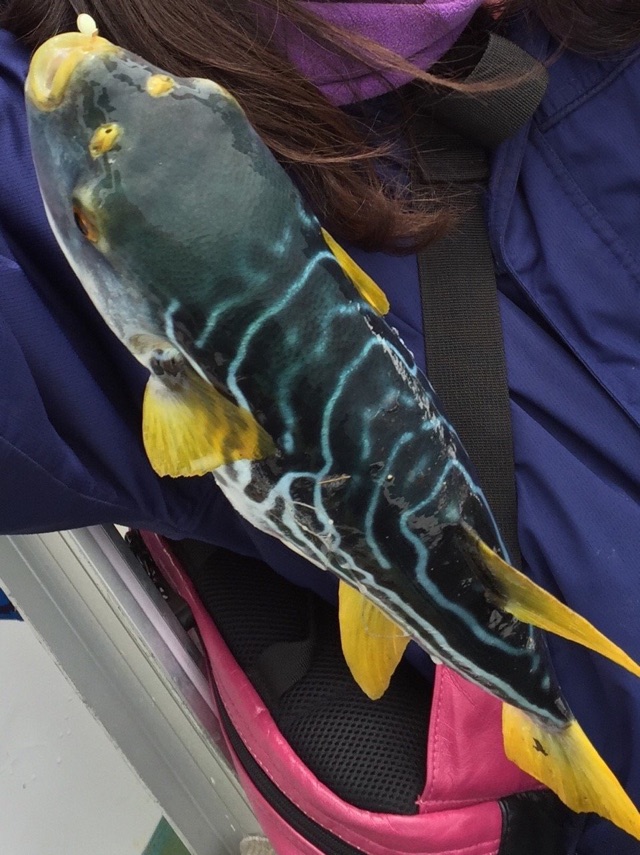 イサキの釣果が渋くなってくると、今度はシマフグが釣れ始めました(笑