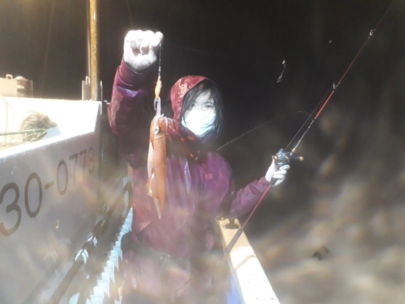 丸吉丸さんにお世話になり、イカメタル調査に行ってきました!前日まで雨、風が強く出船も危うかったですが、なんとか船は出せるとの事。ヤリイカ、マイカが釣れ、麦イカも混ざっているみたいで期待も大きいです。ポイントに着き、まずは20号スタート。水深は45m程。あまり深くないので、巻き上げも楽でした。暫く底を攻めていると1人、2人とヒット。マイカとヤリイカが混ざっています。ヤリイカはサイズがバラバラで、底の方がまだ大きいと感じました。マイカはパラソルサイズでは無いですが、胴長20cmはあったので、まずますです。この時はヒットカラーが分からず、探り探りの釣り方でした。中盤になると、小さい麦イカが群れで浮いてきました。それに伴い、微妙なアタリも増えてきて、かけたら10cm程の麦イカでした。アタリは20mラインで多く出ていますが、麦イカのあたりが多く、大きいイカが釣れない時間が増えてきました。さらに天候も悪くなり、雨が強くなってきました…。まだ風が無いだけマシで、おもりも15、12号で問題ないくらいでした。後半はピンク色が良くあたり、数もポロポロ釣れましたが、すぐに勢いはなくなってしまいました。細目にカラーチェンジする必要があったようです。水深も上の方にあたりが集中したかと思えば、違う方で底でアタリがあったりと棚もまばらでした。結局最後は青物の反応があったらしくベイトが散ってしまい、収竿となりました。ヤリイカももう終わりだと思っていましたが、まだ釣れています。麦イカはこれからみたいですね…。まだまだ調査不足なので、リベンジに行ってきます!
