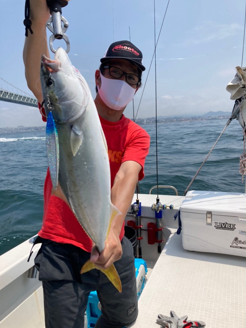 その後潮がやや動き出したタイミングで、同乗のお客様馬場様のジギングサビキにハマチがHIT!