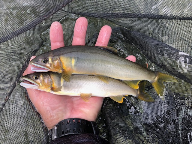 当日は北島の右岸から入川。水位も数日前から下がり平水でちょうど釣りやすい水位で足元から丁寧に探っていくと踝ほどの水深で幸先良く背掛かりで18センチクラス!