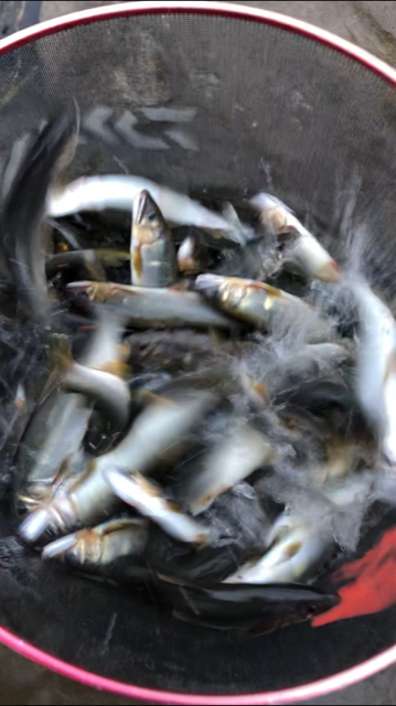 昼休憩に車に戻ろうかと見渡すと車の方までの間に10人以上の釣り人がずらりと並んでいて、休憩に行くと絶対にこのポイントには戻れそうにないのでそのまま昼食無しで17時まで頑張り通しました。8リットルの大型の引き舟を使用してましたが中がいっぱいになり、数えると64匹の鮎を釣ることができ、おとり屋さんの60匹の提示数を上回ることが出来ましたが、長時間の急流の釣りで足腰がフラフラになりましたが久しぶりの九頭竜鮎はやっぱり最高に楽しかったです!