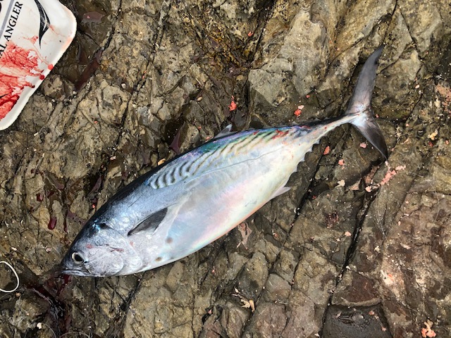 その後はエサ取りは減りましたがアイゴ・サンノジ・小型グレが多くなかなかまともなサイズのグレがつれませんでしたが仕掛が立たないようにオモリを調整し、アイゴ・サンノジができるだけ食わないように釣って行き、35cmクラスの口太グレを追加し『もう1匹!』と意気込んで待ち構えていると、一瞬にしてウキを引き込むアタリが!レバーブレーキを使ってじっくり時間を掛けて寄せてくると45センチ弱ほどの待望のヤイトガツオが顔を見せてくれました。無事にタモ入れを済まし、しっかり閉めて氷水で血抜きをしてクーラーへ!まん丸と肥えた今季初のご馳走を確保!