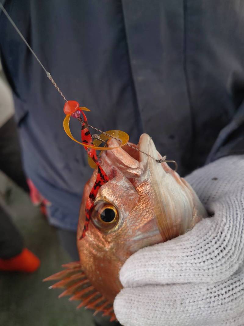 この時期らしい小型ですが、間違いなくマダイ!気合いを入れて巻いてるとアタリが出てフッキングが決まり、小さいですがなんとかキープできました。