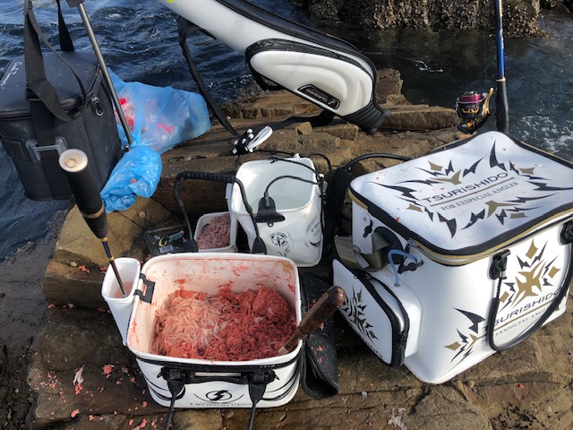 見える範囲にまき餌が効きだすとキタマクラなどが多数いいて、足元周辺には巨大カンダイが3匹ほどウロウロしだしたので竿3本ぐらい沖側を狙っていると早々にアタリが!1匹目は28センチ程の尾長グレ!とりあえずキーパーバッカンに確保。弱いサラシが更に弱くなり、下り潮が動き出したので左前方を攻めます。なかなか当たりのない中モジモジしたアタリが。合わせを入れると下品な穂先を叩く強い引き…40cmクラスのアイゴの登場、同じように攻めていくとアイゴの連発…。