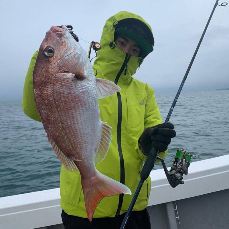 船長すかさずエリア変更、ここでスタッフ中井にも待望のアタリ!タイ特有の三段引きを楽しんで上がってきたのは食べごろサイズの綺麗なマダイ!赤黒のネクタイセットでゲットです。