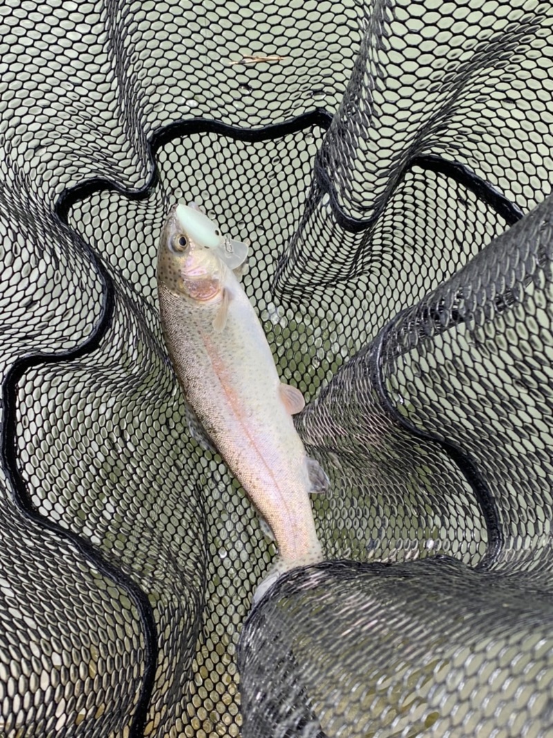 まずは朝一食い気の高い魚を狙って派手なオレンジ金スプーンをチョイス。幸先よく中層でニジマスをゲット!