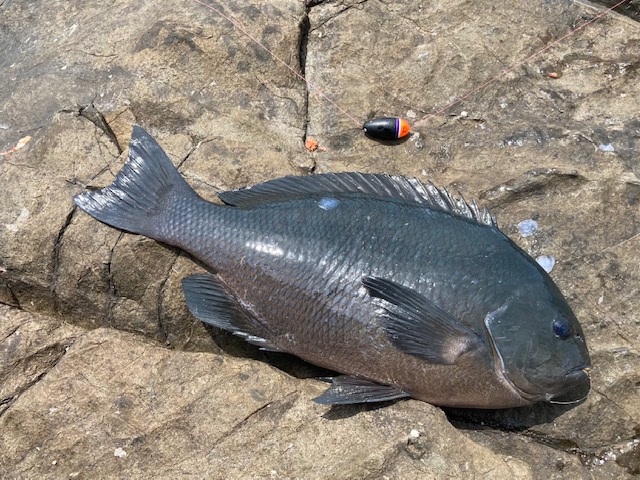 元の場所の磯際を後ろの高い所から狙うとフグの気配も無く良い感じで数等目で浮きが海中へ!かなり強烈な横への走りで明らかにグレ以外の魚ですがかなりの引きに期待しましたが上がってきたのは50センチクラスのチヌ...。チヌ狙いなら良いのですがグレ狙いでのチヌは残念ながら外道でリリース。