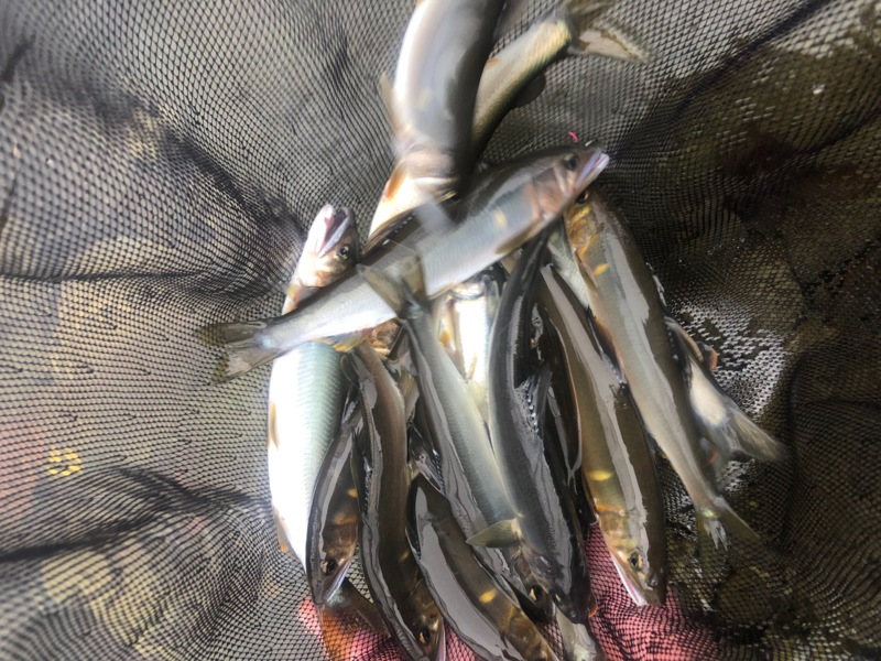 上に歩いていいポイントも見つけるも先日の雨の影響か川底は枝だらけでオトリを消耗。最後は橋よりも下流のポイントで4本追加して雨降りも強くなった16:00に終了しました!