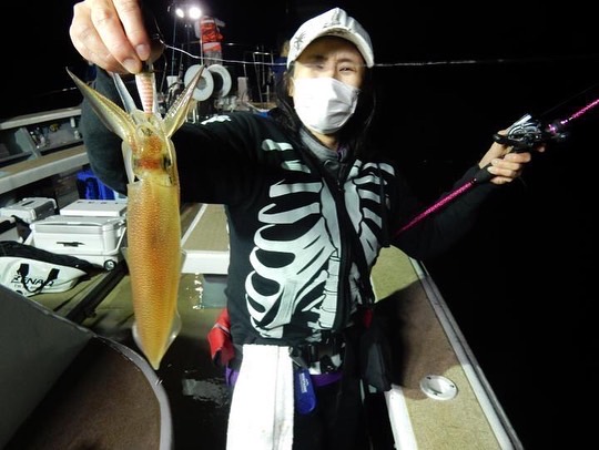 右舷の胴でいきなりシロイカあがって気合い入ります 穂先をガン見してるのに…全くわかりません。少しして船長さんが見に来てくれて 長い仕掛けに変えてオモリグみたいに上に鉛スッテ 下に浮きスッテへ🤔誘い方も「ワンピッチワンジャークからの止める」をやってみて!と