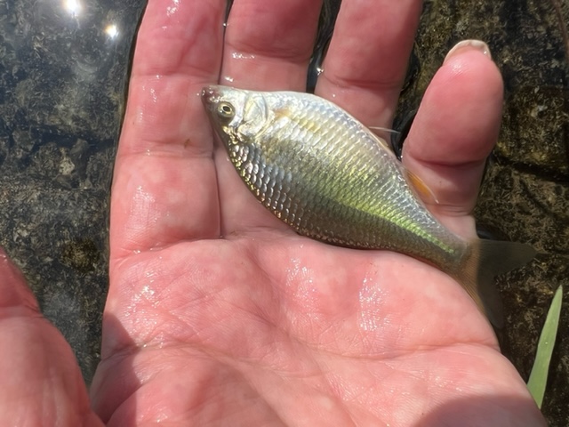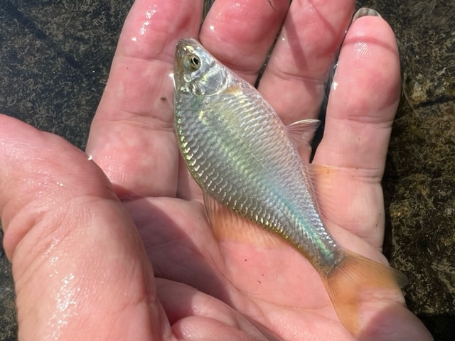 何回か空振りした挙句上がってきたのは4センチほどのメスのカネヒラ。