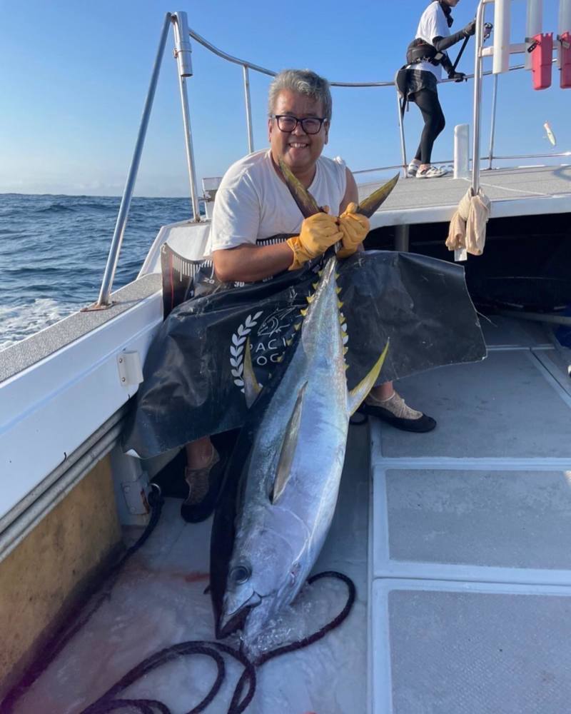 惜しくも山田のキハダマグロはフックアウトしましたが、お客様はしっかりフッキングされ、上がってきたのは35キロのキハダマグロでした🐟