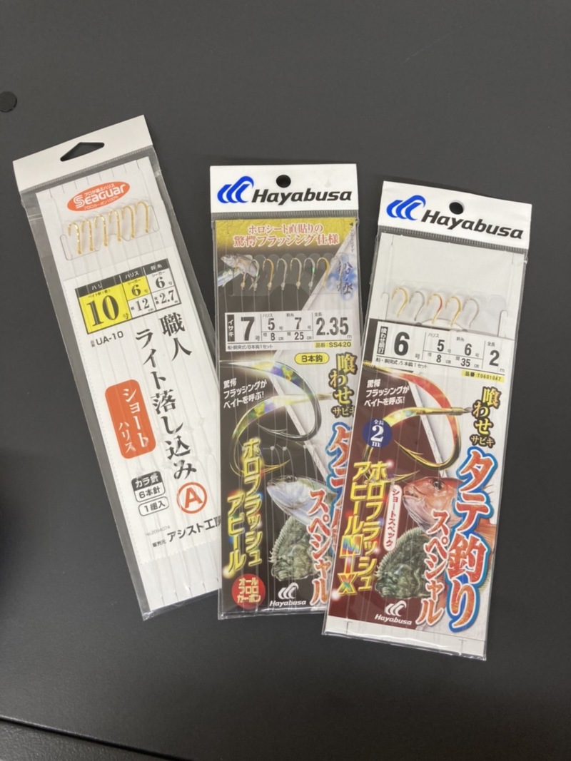 当日の仕掛け、タックルですがベイトが小さいということも有りみんなの道具を見ていると竿は少し長めのやわらかめの竿のほうがイワシの付きが良かったように見えました!仕掛けは鳴門などでも定番のハヤブサのタテ釣りSPシリーズやアシスト工房の職人ライト落し込みAが手堅いようでした!