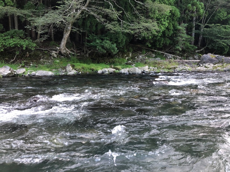 激流はあきらめ流れの緩い箇所へ歩いて移動し誰も釣り人がいないので広範囲にキャスト。