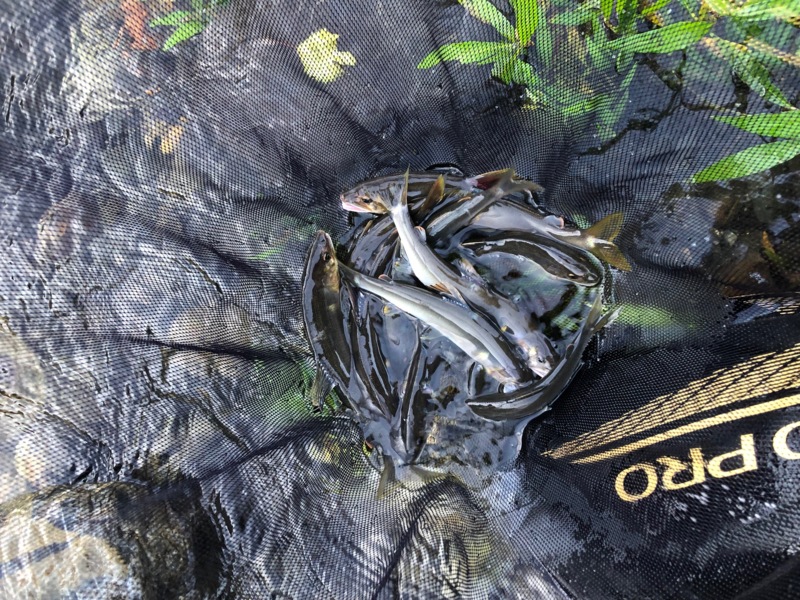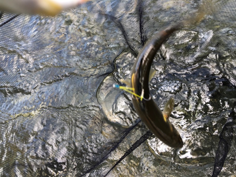 パターンを変えて流れのヨレが出来ている少し水深のあるところを上流から止めて待っていると手元にガツンと強めの感触!