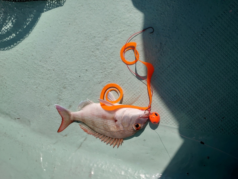 一投目から当たりが有り、こちらも先に落とした同行者がまずチャリコを釣り、入れるとすぐに釣っていました。自分もスカートのカラーをやり変え真似をするとチャリコが釣れ、巻くスピードも早めにしてチャリコ対策もしました。しかし釣れるのはチャリコが多く松岡SPメガαで大鯛を狙うもこれでもこましな鯛がつれ迷走に。