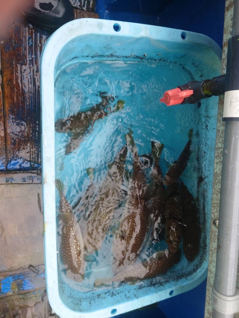 フグの大きさは20cm代が多く、まとまったサイズが釣れるので多くキープもできました。この時は青柳が反応良かったです。その次に海連丸さんオリジナルエビが良くあたりました。それから暫くすると潮が完全止まってしまい、アタリが少なくなりました。この時は我慢の釣りになりましたが潮も動き出し、 ようやくアタリが復活し始めました。しかし、潮が今度は早すぎて30号では底が取れなくなりました。そこで30号2つつけると、底取りできるようになりました。こまめに回収しないといけなくなりましたが高活性は最後まで続き、時間が来て収竿となりました。
