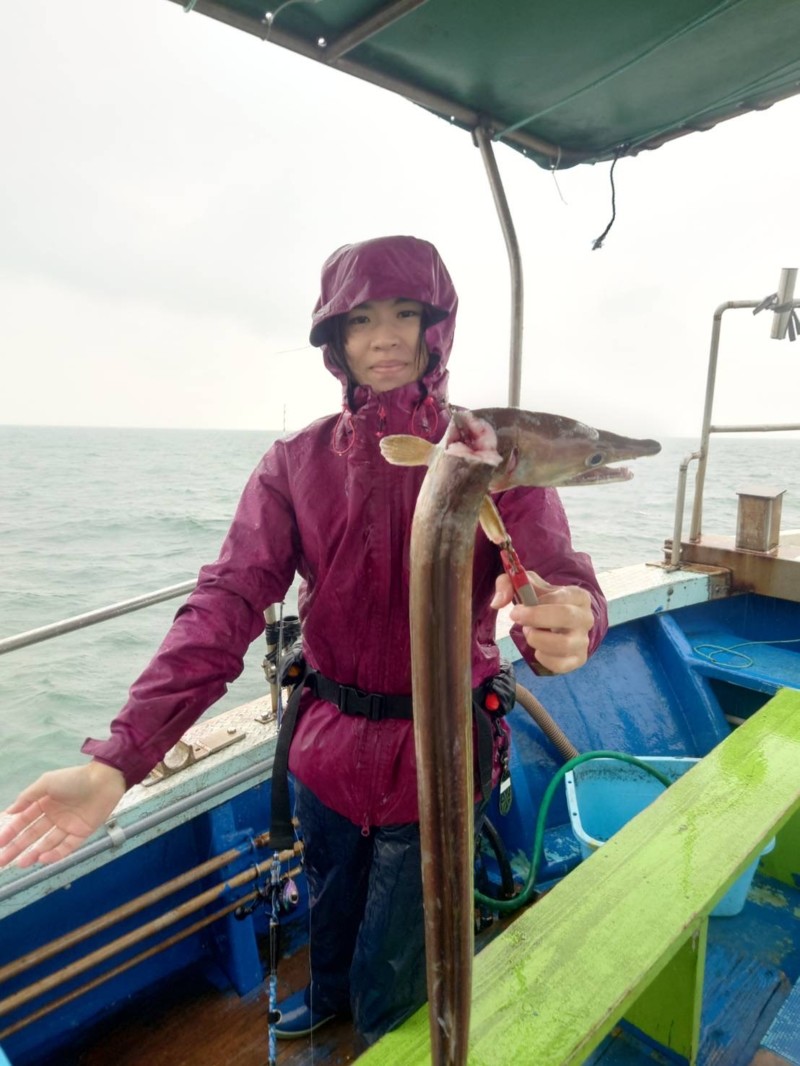 感染予防対策をし、海連丸さんにお世話になりショウサイフグ釣りに行って来ました!この時の天候はあいにくの雨。しかも気温も雨のせいで低くなり、10度を下回っていました。ポイントは垂水沖からスタート。水深は30m程。潮はまだ早くなかったので、オモリは30号を使用。エサはアルゼンチン赤エビ、青柳、海連丸さんオリジナルエビを使用しました。最初はカットウ仕掛にそれぞれつけて、何が1番食いが良いか比べてみます。誘い方は仕掛を底まで落としたら、糸ふけを取りゆっくり竿をしゃくり上げます。そして底ギリギリまでゆっくり竿を降ろします。あまり激しくしゃくり上げるとフグがびっくりして仕掛から離れてしまうので、注意が必要です。この日は活性が高かったのか誘ってすぐにヒットしました。途中とても重たい物を掛けたので、大きいフグがかかったと思えばあがってきたのは大きい鱧でした!生まれて始めて生きている鱧を見たので、貴重な経験をしました。