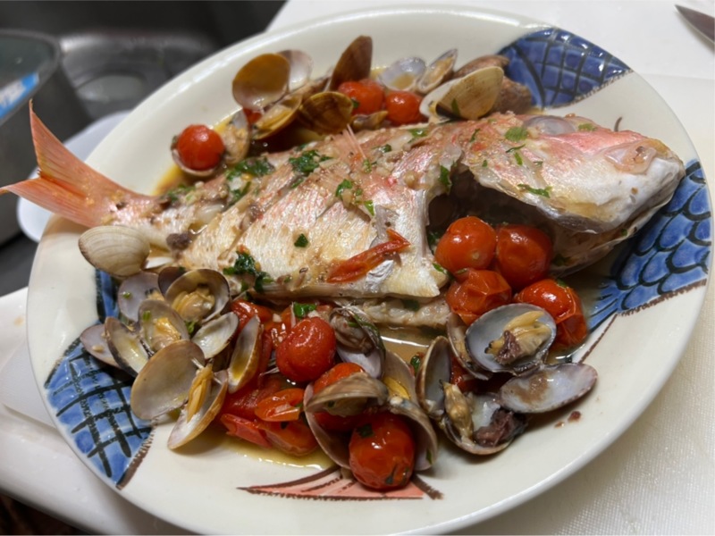 帰ってからスタッフ西川が連子鯛でアクアパッツァと炙り刺身、胡麻鯛にして美味しくいただきました❣️