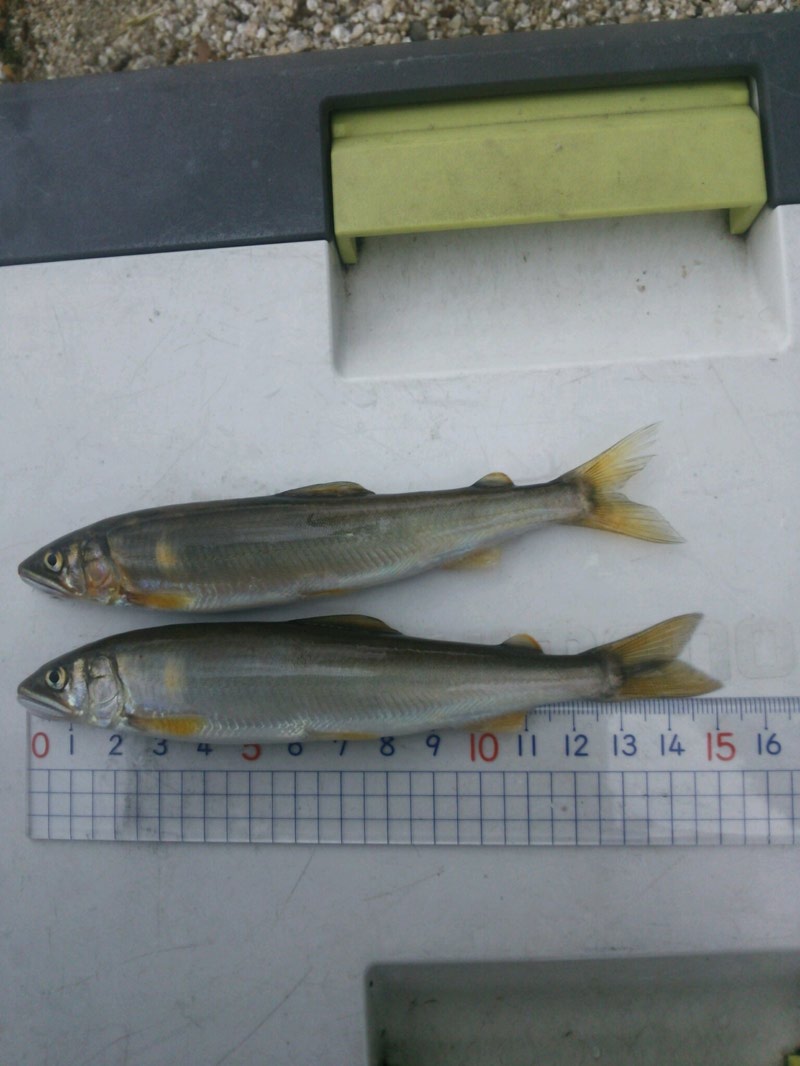 久しぶりの雨が早朝まで降り今回の釣行は無理と思ったが、滋賀県北部の予報を見て6時には雨が止むとのことで視察すべく前回好調であった今津のホテル裏へ向けて朝7時に自宅を出発。釣り場に8時過ぎに到着。雨も上がり無風・べたなぎの好条件。が、湖岸に流れ込む河川が濁流でポイントが茶色く濁っている。これでは釣りにならないと判断し湖週道路を南下し北小松まで来てしまった。比良山系の小河川は比較的水が澄んでおり釣りには何の影響もない。むしろ新鮮な水が入ってこあゆの活性も上がってくる。それを実証するかのように浜ではあちこち小鮎のライズが見られる。早速駐車場の目の前に釣り座を構え竿4.5M・春瀬工芸の完全仕掛けにパールビーズ3本鈎をセット。オモリは前回軽い仕掛けで好反応だったので0.3号のオモリ。こませちゃんをラセンにセットして釣り始める。もちろんウエダーで膝上まで入りごろた石と砂地の境目をポイントとして釣る。すぐに13センチ級が釣れ今日も調子よく釣れ続く。12時頃町内のチャイムが鳴るまでに3桁を達成し終了。近くで釣っていた人もほぼ入れ食い状態でした。もう少し雨が降れば河川の釣りが面白くなってくる。