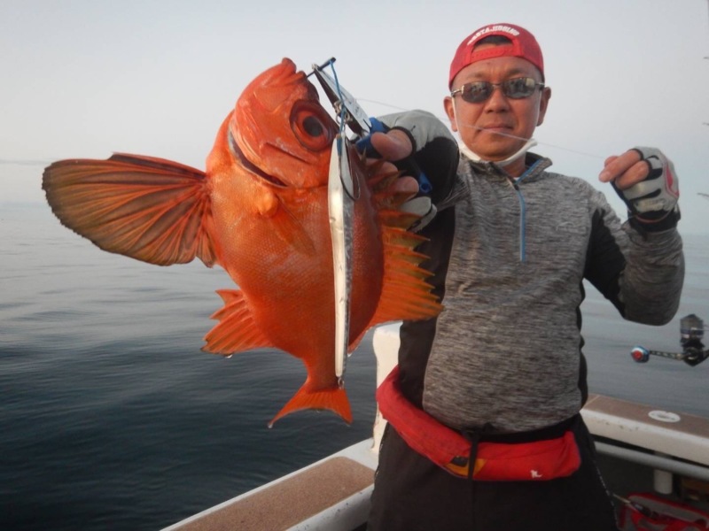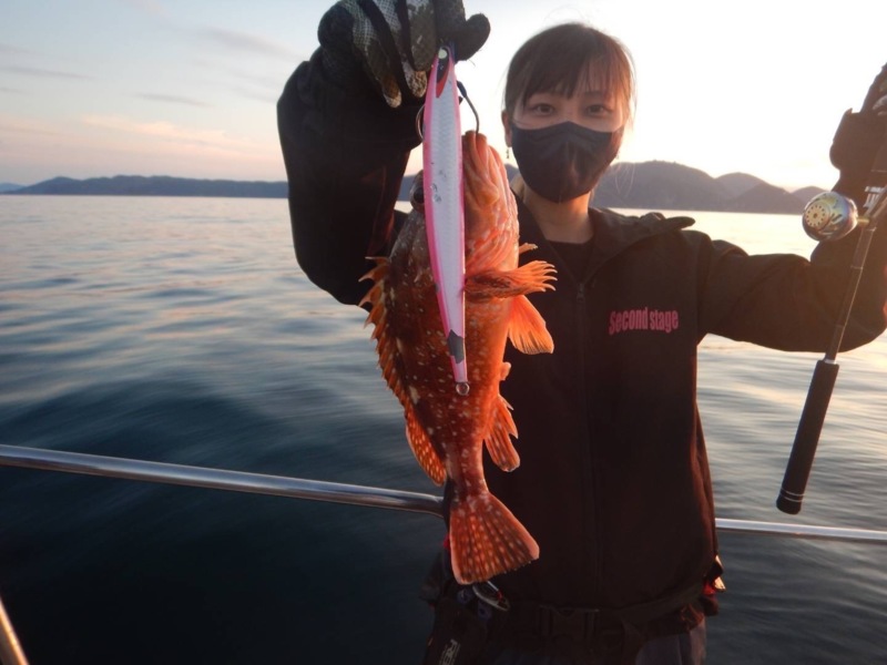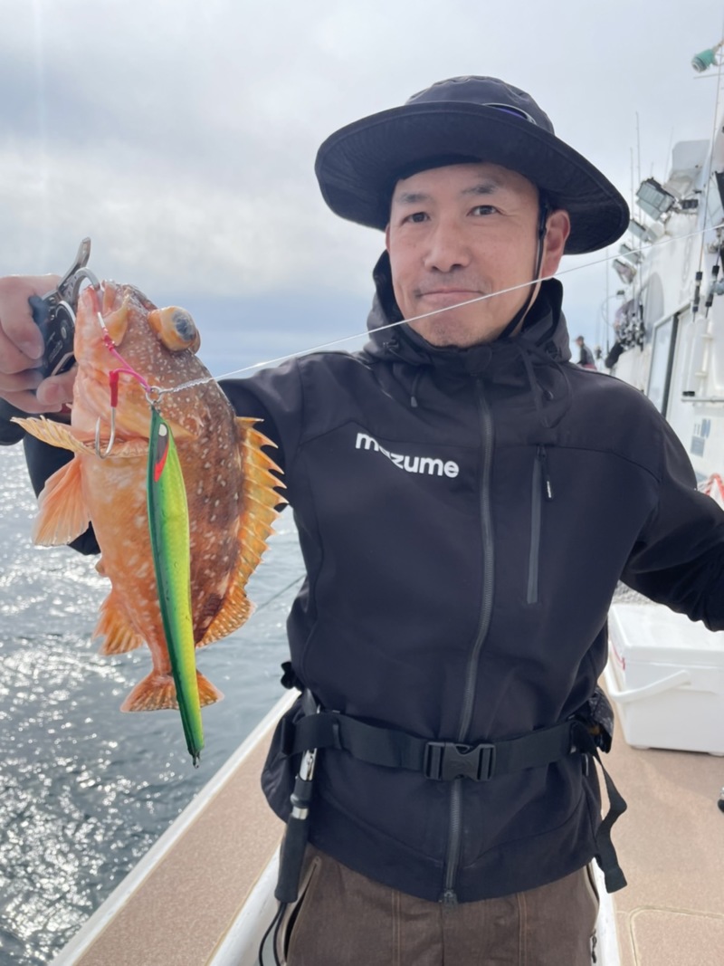 上がってきたのは嬉しいゲストのウッカリカサゴ!ベイトタックル初挑戦のお客様で、なんと一投目のヒットでしたが難なく使いこなして頂き、キャッチすることができました!