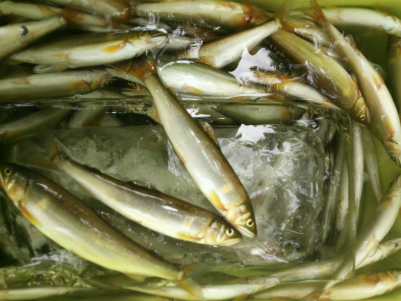 前々日の雨でコンディションが良いと判断して湖西安曇川手前の鴨川に釣行。いつもの161号線上流でAM5時から釣り開始。水量・水色と申し分なく10~16センチ級が入れ食い。竿3.4Mに春瀬工芸底ずるラセンセットで仕掛はパールビーズ1.5号3本鈎。底ずるラセン0.5号。エサは「こませちゃん」。9時頃まで釣れ続き約2.0キロの釣果。残念なことに三分の一は冷水病でした。急な水温低下が原因でしょうか。ハスやニゴイが多くいるので日が昇ると小鮎を追い掛け回すので釣果ダウンします。