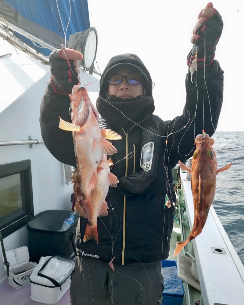 シーズンに入ったばかりの沖メバルを胴付き仕掛けで狙ってきました。餌は釣船で準備頂いたホタルイカを主に使用。