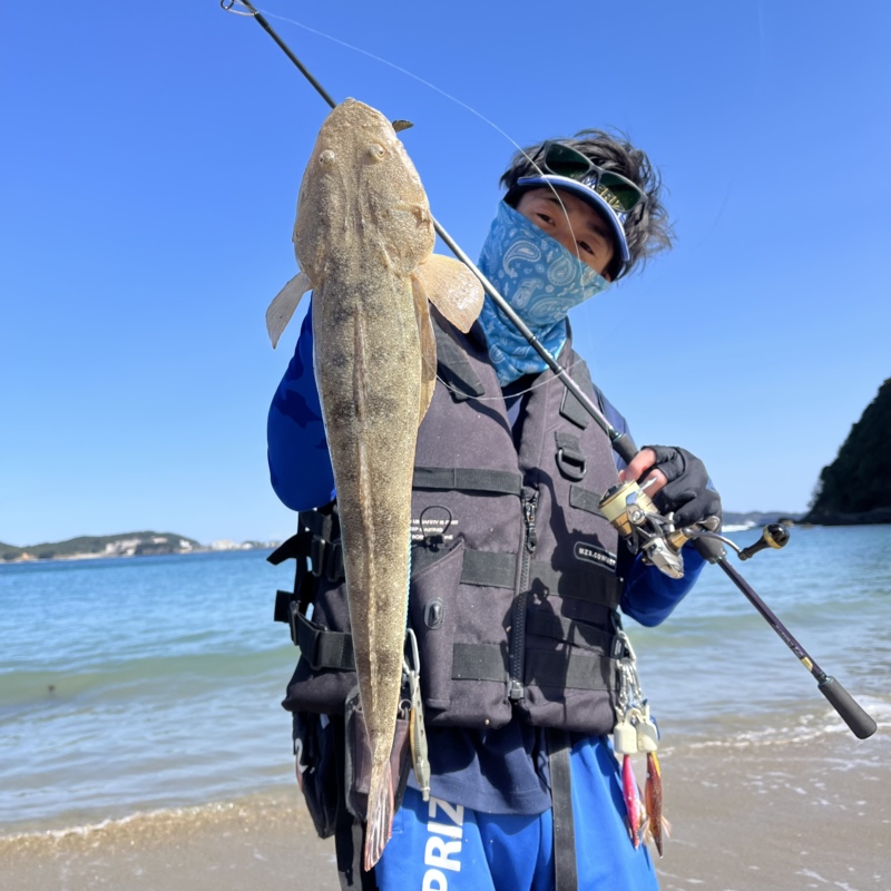 イワシが群れをなしているところにUK BAIT7gを通すと1発でヒット!ゴンゴンと首を振る引きであがってきたのはマゴチでした!!