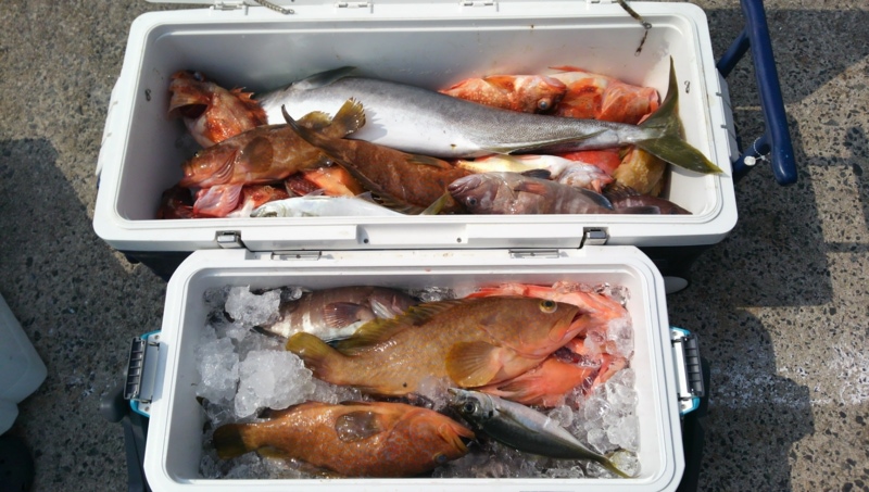 朝から40~50センチ近い良型のアコウ、マハタ、ガシラが出迎えてくれました。昼前後には食い渋りましたが、全員で約20匹を釣ることができました。150グラム前後のインチクやスローピッチ系ジグのシルバー、ピンク系カラーがグッドサイズの根魚には効果的でした。