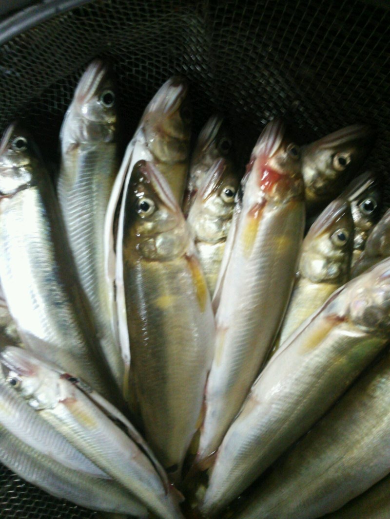 梅雨で雨が降ったりやんだりで河川状況が良いと判断し湖北知内川へ釣行。朝5時に現地到着もいきなりの雷雨で釣りができない。1時間車で待機し小雨になってきたので6時スタート。国道から2つ目の橋(醍醐橋)の上手に釣り座を構える。橋の上からは相変わらず魚影が確認できない。竿3.4Mはままつ方式完全仕掛けにパールビーズ3本鈎。底ずるラセンは0.5号。水深約30センチでウキ下を60センチにする。まづ流れのヨレに第一投。予想に反していきなり15センチ級が上がった。1つのポイントに10匹ペースで周囲を釣り歩く。9時頃にゲリラ豪雨で水量が増し濁りも出てきたので終了にした。この地点で釣果は約60匹ほど。15.6センチ級が20数引き混じった。やはり川の小鮎は大きい。帰りがけに下流を調査。JR鉄橋上下はまだ魚影が確認できそこそこの釣果が上がっていた。最下流のヤナはがっちり閉まって小鮎が遡上できない状態。大水が出ない限り釣果は乏しいだろう。