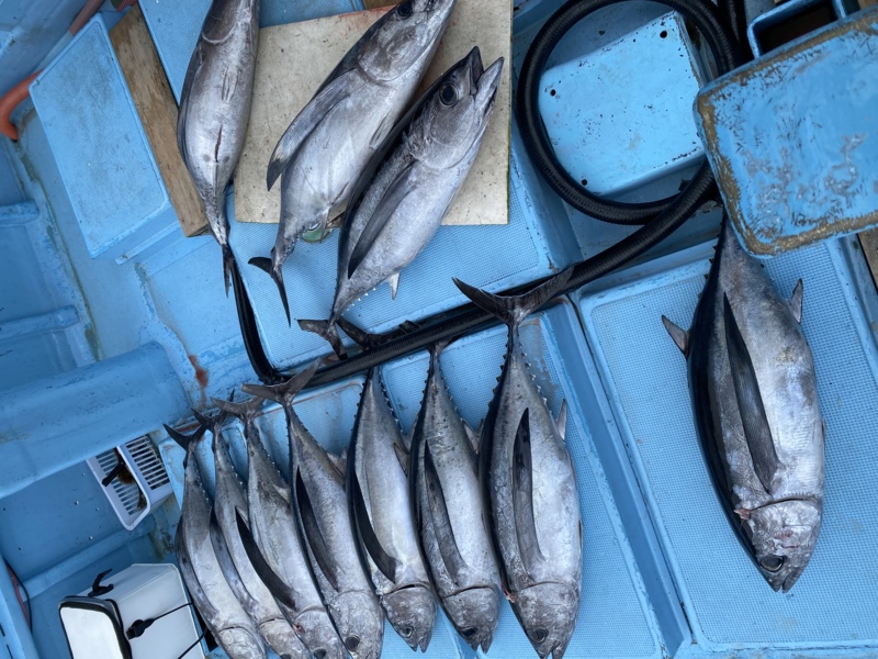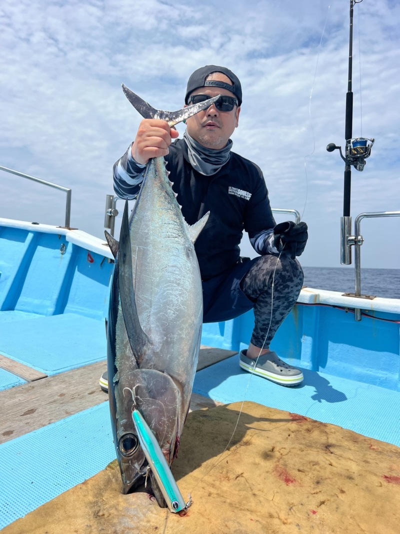 先日和歌山県の悠真丸さんにお世話なり、キハダキャスティングへ行ってきました!ここ数日は調子が悪くカツオナブラも無いような感じでしたが、潮は悪くない状況。期待を胸に出船しましたが、9時頃までクルージングタイム。これはダメかと思った矢先、小規模の鳥山を発見!!しかし、なかなか大きくならず魚も水面までは上がって来ない状況が続きます。20分程追いかけて、鳥がまとまり出したタイミングでようやく船長からのGOサインが出ました!すると一投目からヒット!が、なんか軽い?それもそのはず上がってきたのはまさかの備長鮪笑。そこからは出るわ出るわで終わってみれば船中13本と、魚種は違えど大漁で終わることが出来ました。最近はまたメバチやカツオ、キハダも釣れ出しているので、是非チャレンジしてみて下さい!