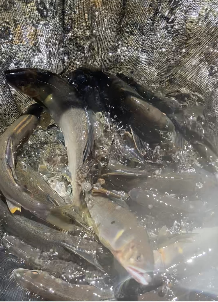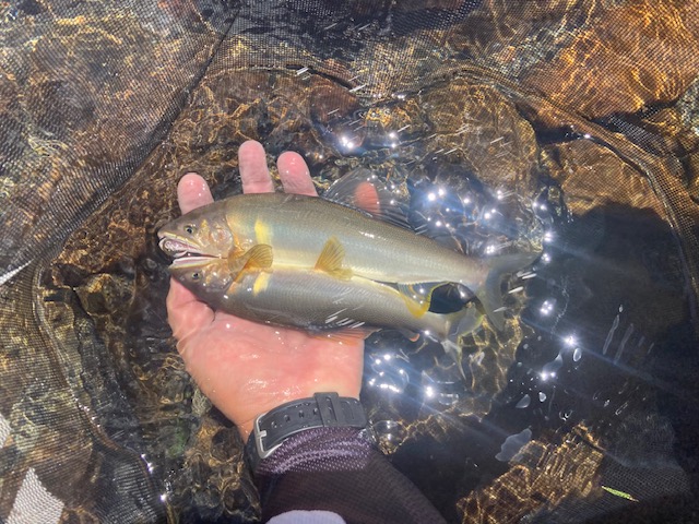 すぐにばらした周辺を探っていくと野鮎からの反応が!なかなかの引きに慎重に取り込むと23cmクラスの良型!しかしエラ掛かり。