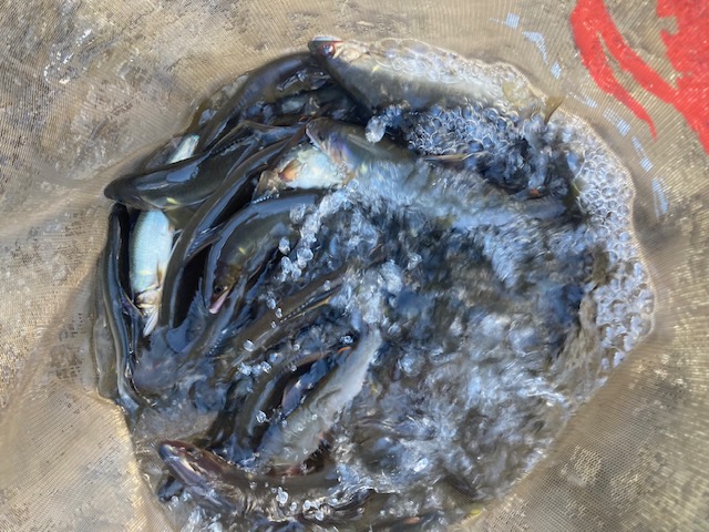 ここのエリアは先日までの雨の影響でまだ水位が高く、流れも強い状況。点在する黒い石周りを探っていくとなかなかの強いアタリ!1匹目は20cm強ですが午前中のポイントの鮎とは追い気も違い、縄張り鮎がいると掛かりも早く朝に入ったポイントの見切りが遅かったと感じました。ここでは大サイズの鮎もオトリに使い大サイズも掛かったので強い鮎の引きを堪能しました。